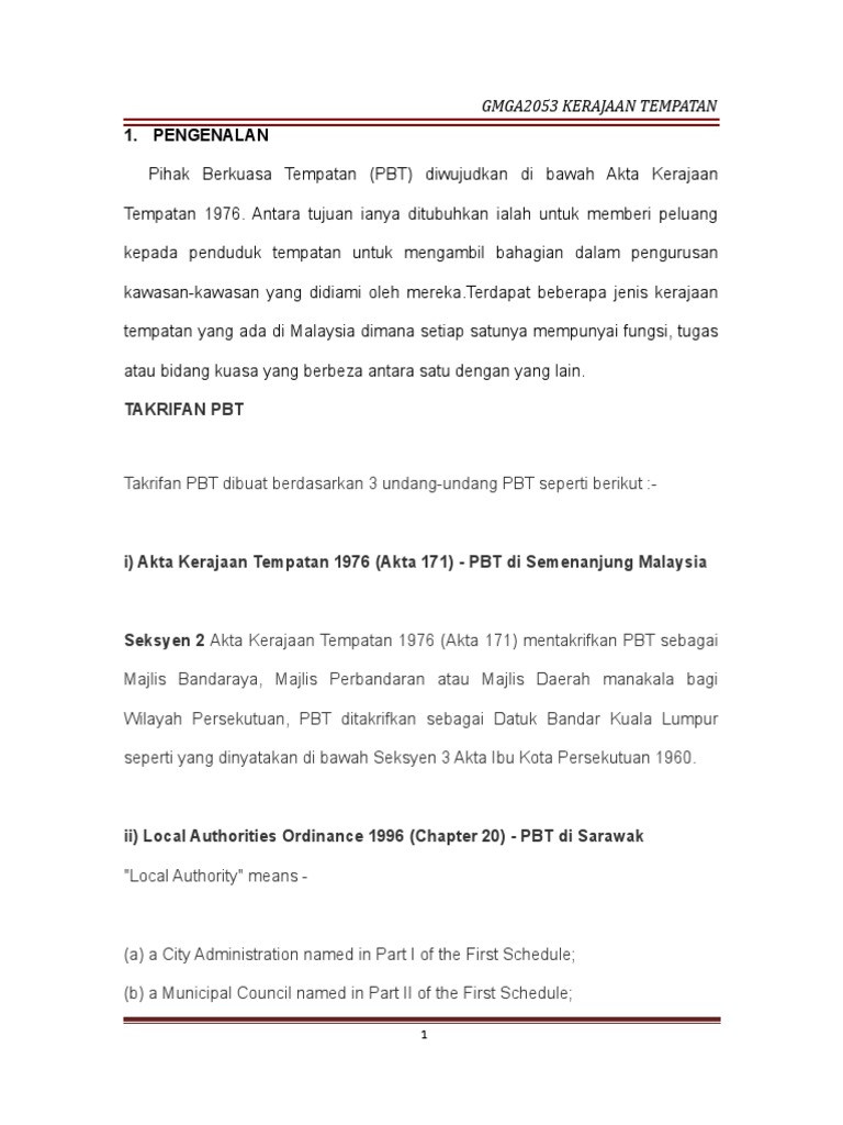 Akta Kerajaan Tempatan 1976 (Akta 171) : .(akta 171) undang akta kerajaan tempatan (akta 171) i amt)anan ivo.y.. Pindaan ke atas akta kerajaan tempatan 1976 (akta 171) akan memberi kuasa kepada pihak berkuasa tempatan (pbt) untuk mengambil tindakan lebih tegas ke atas kilang yang didapati melakukan pencemaran, kata menteri perumahan dan kerajaan tempatan zuraida kamaruddin. Tarikh perkenan diraja … … … … 18 mac 1976 tarikh penyiaran dalam warta … … … 2001. Mengandungi segala pindaan hingga 1 januari 2006. 3) akta 133 akta jalan, parit & bangunan 1974. Ini kerana secara tradisinya institusi islam dikaitkan dengan pentadbiran agama islam yang diurustadbir oleh majlis agama islam negeri.